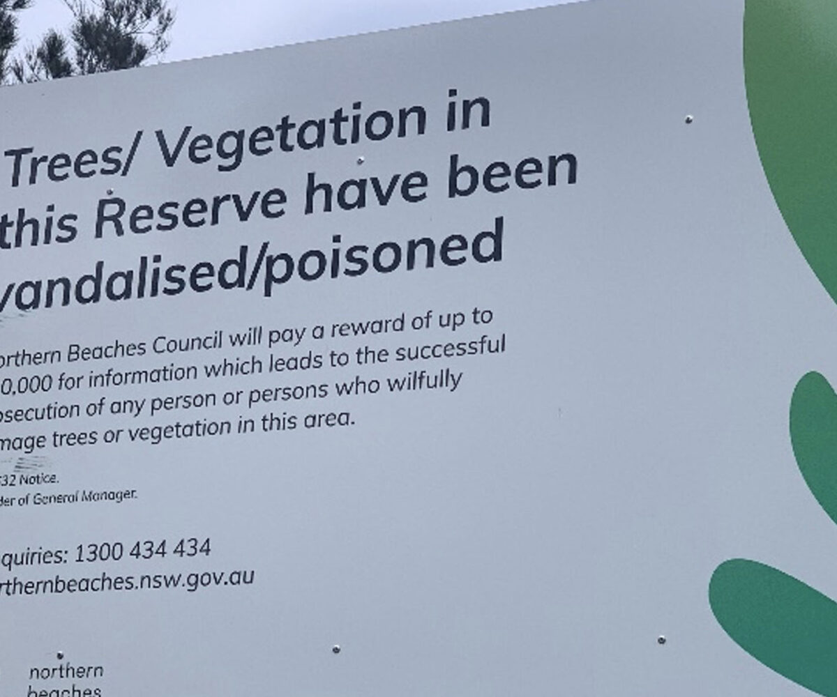 We have been distressed to observe that four Casuarina trees located in the small waterside reserve between 877a and 879 Barrenjoey Road have recently been poisoned and subsequently removed by Council contractors. The Council have erected signs to this effect and there is a reward for any information regarding the event. Council have advised that new Angophora trees will be planted as replacements after the summer heat has eased. The two Council signs will remain.